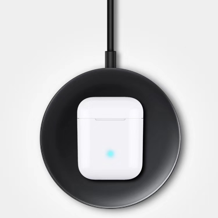 Наушники AirPods можно легко и быстро зарядить в футляре с возможностью беспроводной зарядки. Для этого достаточно положить футляр на устройство для беспроводной зарядки стандарта Qi. Светодиодный индикатор на передней панели футляра указывает, что наушники AirPods заряжаются. Если у вас под рукой нет устройства для беспроводной зарядки, можно зарядить футляр через разъём Lightning.